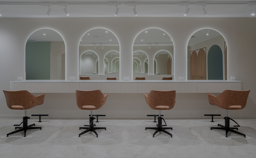 LED Circa Backlit Round Mirrors von Comfortel wurden hinzugefügt, um das Licht im Raum zu verbessern, und gleitende Friseurbasins wurden in die maßgeschneiderte Schreinerei und den Einbauschränke integriert.