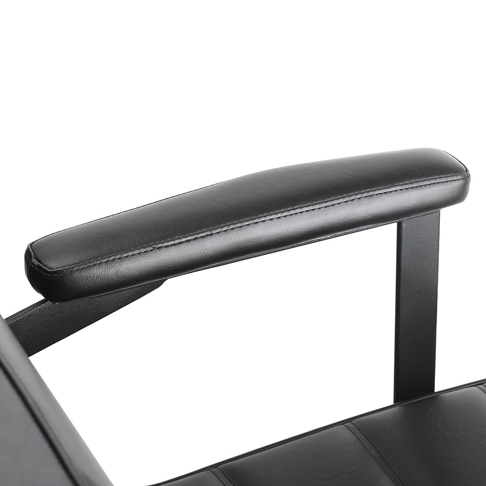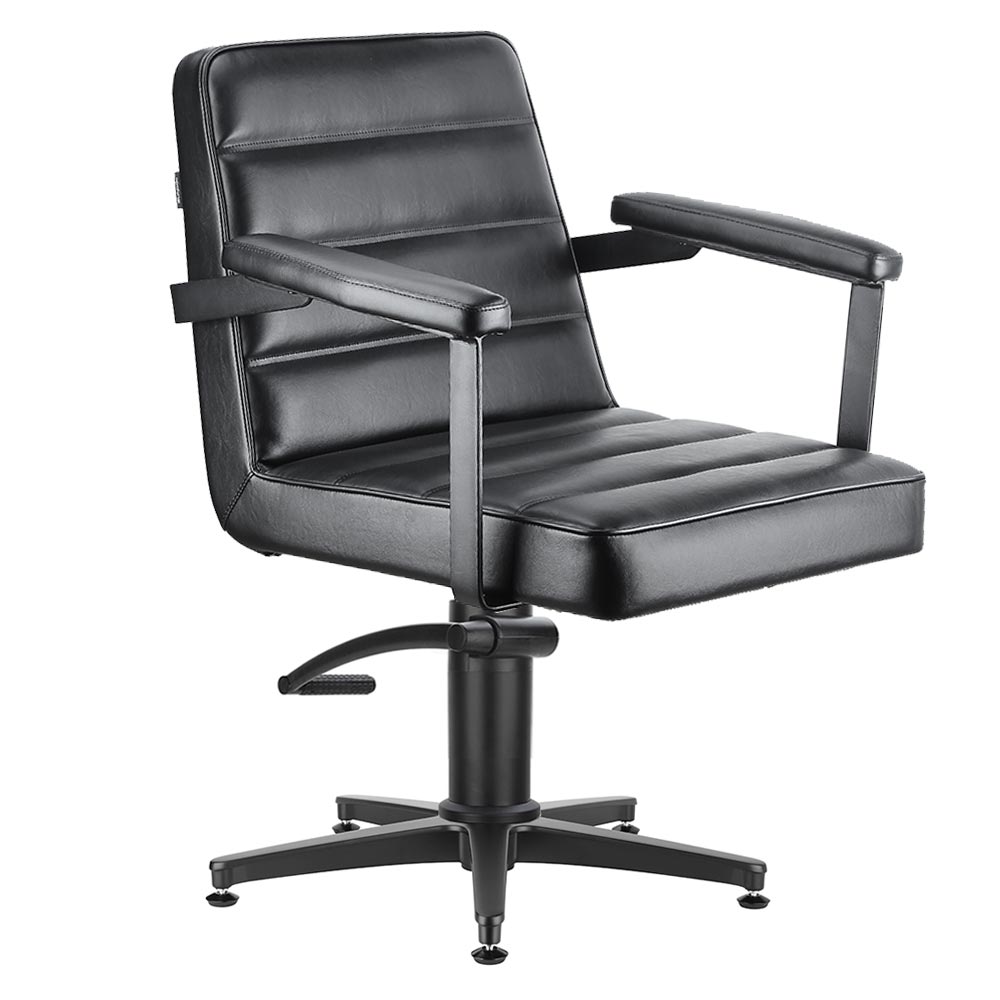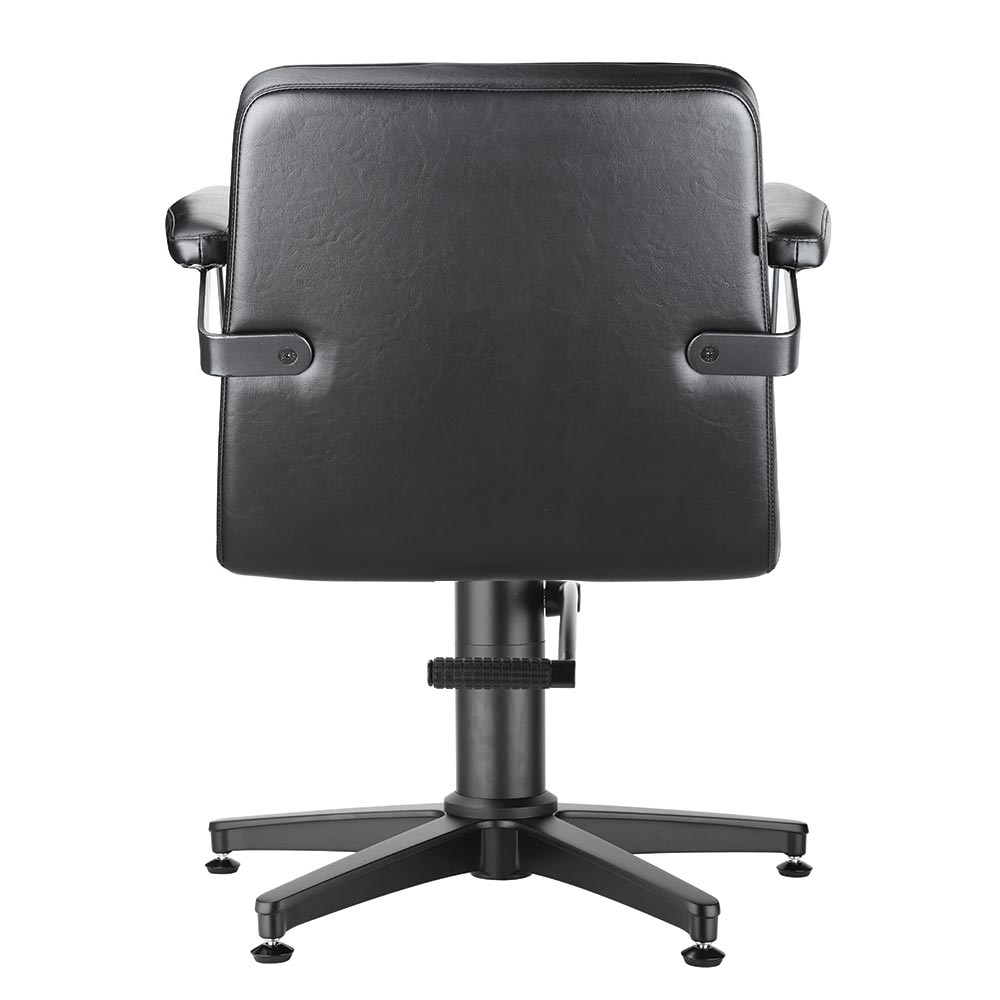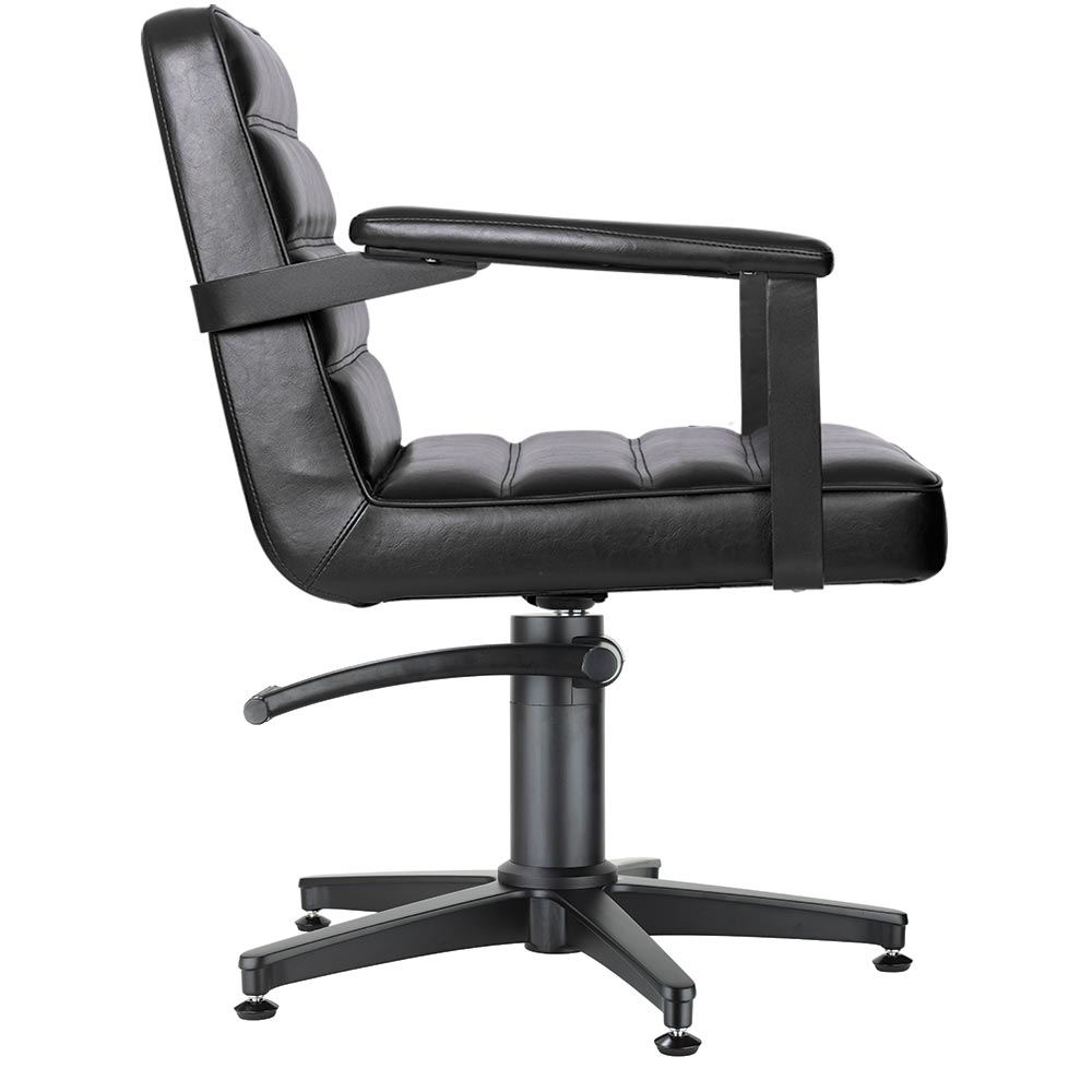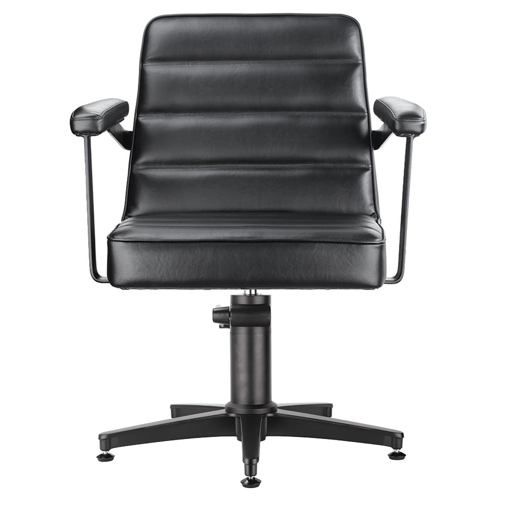 Der absolut coole Friseurstuhl ist zeitlos und besticht durch eine markante Silhouette mit detaillierten Nähten und schlanken, mattschwarzen, gepolsterten Armlehnen.